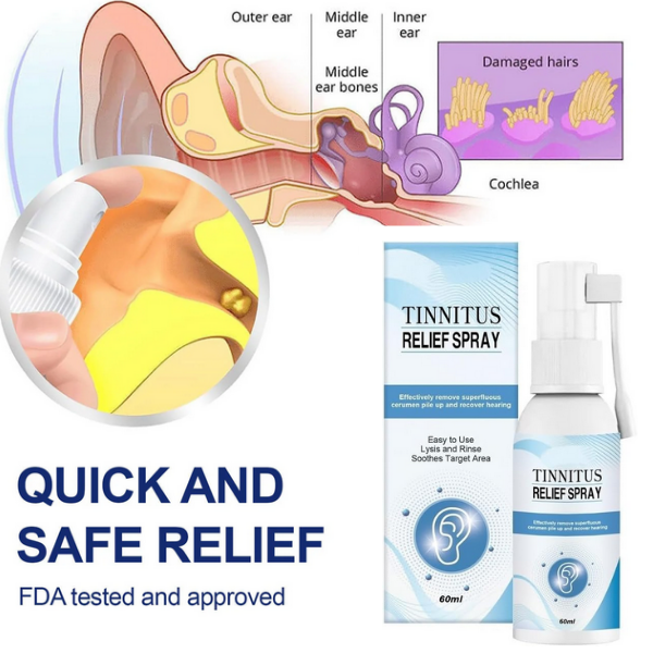 Tinnitus Relief Spray is a natural alternative that replaces many prescription and over-the-counter medications and products to relieve inflammation in the ear canals, as it quickly and painlessly clears the inner and outer ear canals of accumulated wax, normalizes blood circulation, and relaxes muscles.